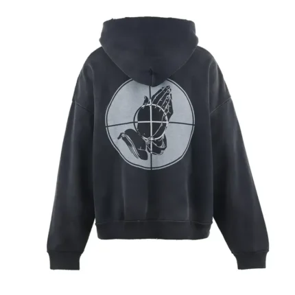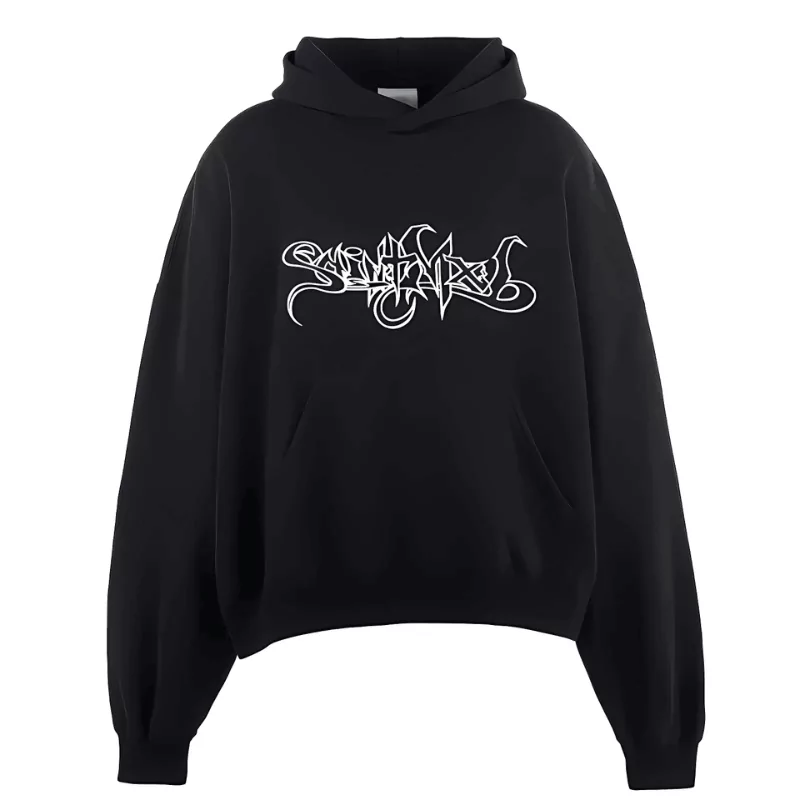 Saint Michael’s graphic program for this specific hoodie has been developed with the understanding that every design element needs to earn its presence on the garment. Whether the graphic is a standalone motif or part of a more complex visual composition, it has been scaled, positioned, and applied with attention to how it interacts with the black ground, the hoodie’s construction seams, and the viewer’s experience of the piece from different distances and angles. The graphic application is executed with techniques that ensure longevity through regular use.