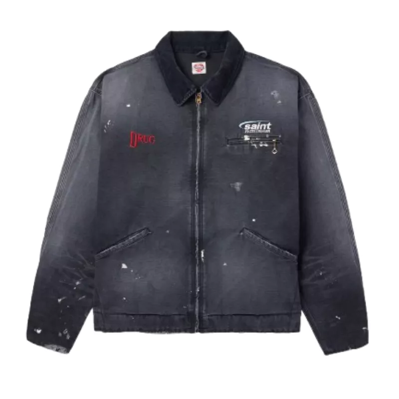 Logo embroidery contributes a third material language to the jacket’s texture program. Embroidery sits above the surface of the canvas, catching light differently than printed graphics and creating a three-dimensional quality that adds depth to the jacket’s visual character. The Saint Michael logo appears in its characteristic form, rendered in thread rather than ink or heat transfer, making a statement about craft and permanence that aligns with the jacket’s overall material philosophy.